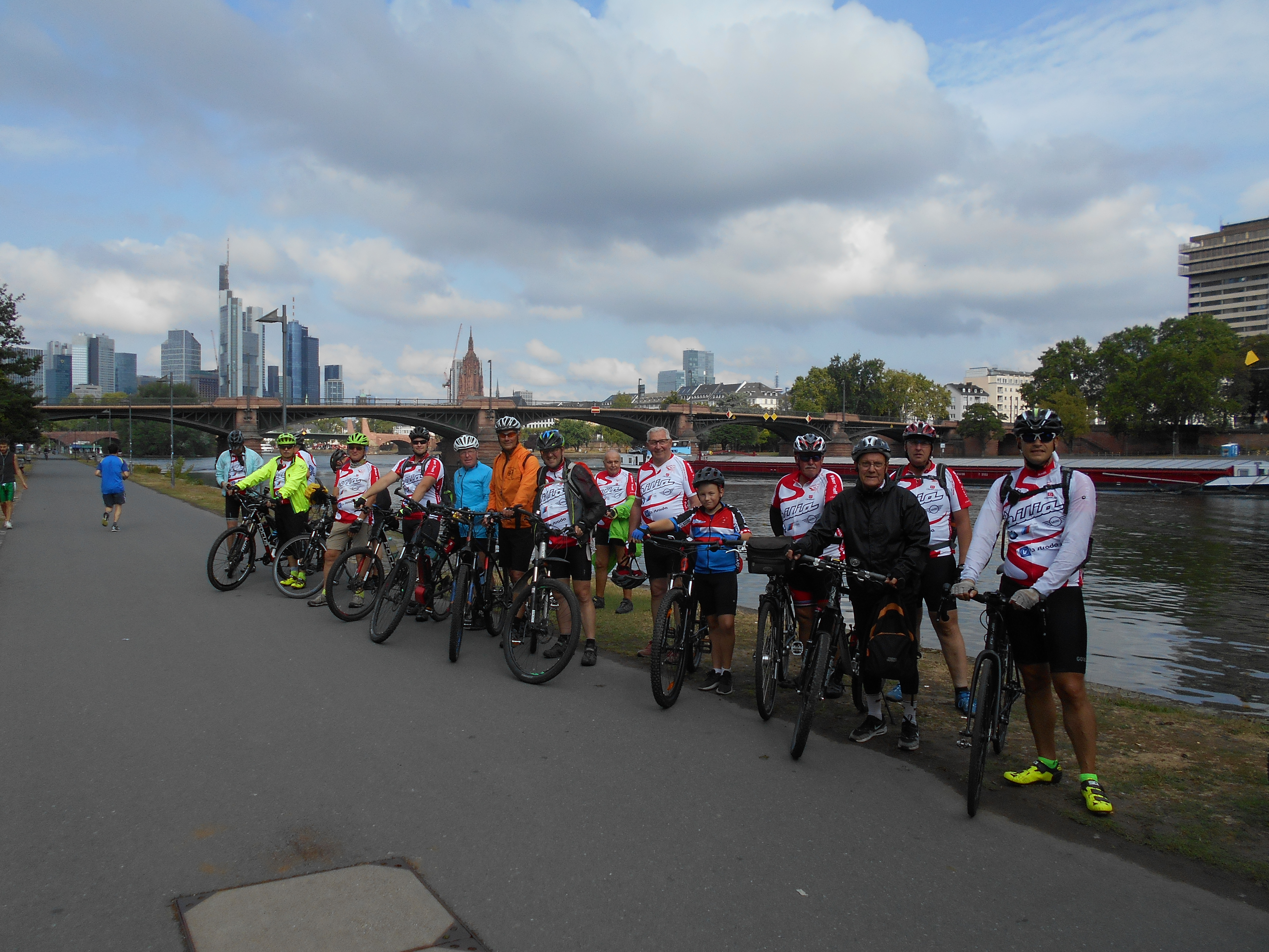 Jörg Möbus, der wieder die computergestützte Routenplanung und Führung hatte, leitete die Gruppe der Nidda entlang auf dem Radweg R4 über Bad Vilbel nach Höchst zur Nidda-Mündung. In Höchst waren die beruflichen Ortskenntnisse des PKW-Begleiters Erich Eiser von Vorteil, zumal Radweg-Beschilderungen nicht immer aus der Radler-Perspektive gemacht sind. Auf dem Land bietet die nördliche R3a-Route interessante Blicke, z.B. von der "Flörsheimer Warte" aus zur Frankfurter Skyline und ins nördliche Rhein-Main-Gebiet. Nach 100 km wurde der erste Übernachtungs-Ort, Hochheim am Main, erreicht.