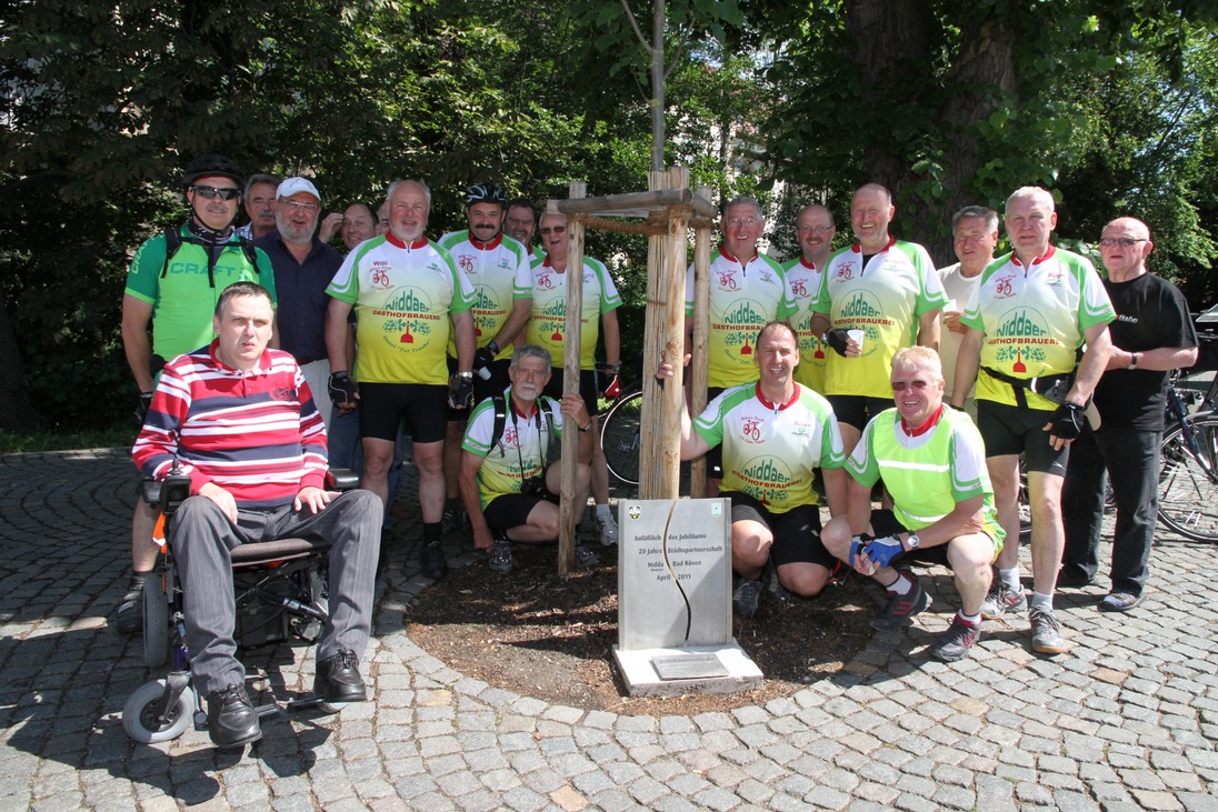 Erfurt als erstes Etappenziel zeigte sich während einer Stadtführung mit seinen Sehenswürdigkeiten. Auch Nicht-Thüringer kennen Dom und Krämerbrücke. Der Waidspeicher als Zentrum des historischen Färber-Handwerks war vielen Teilnehmern jedoch neu. Die Landeshauptstadt und Studentenstadt präsentierte sich mit zahlreichen Straßen-Musikbands und Gaukler-Gruppen. Am zweiten Tag wurde Weimar angefahren. Aus Zeitgründen reichte es nur zum Foto-Termin beim Goethe-Schiller-Denkmal und kurzer Mittags-Rast. Durch das "Thüringer Tor" ging's mit erhöhter Drehzahl und einem ungeplantem Viehtrieb nach Sachsen-Anhalt zu Niddas Schwesterstadt Bad Kösen. Mit-Radler Helmut Jung hatte im Vorfeld Verbindung aufgenommen zu örtlichen Repräsentanten des Verschwisterungsvereins. Durch das vorausfahrende Geiß-Niddaer Begleit-Team Hermann Diehl und Erich Eiser waren die Gastgeber aktuell vorinformiert worden. An der Jubiläums-Linde, zur zwanzigjährigen Partnerschaft von Bad Kösen und Nidda im vorigen Jahr gepflanzt, wurde die Truppe mit Sekt empfangen. Im Namen des Verschwiste-rungsvereines und der städtischen Gremien von Bad Kösen, inzwischen Stadtteil von Naumburg, begrüßte J.U. Bühner die Niddaer Radler. H. Jung bedankte sich und erinnerte dabei an die "Gründerzeit" der Verschwisterung im Jahr 1991. Anschließend fand mit Günter Groß eine informative Kurpark-Führung statt, u.a. zur historischen Salinen-Technik. Bad Kösen hat eines der größten deutschen Gradierwerke mit 20 Meter Höhe und 400 Meter Länge. Der Biker-Besuch wurde mittlerweile auch in der dortigen Presse veröffentlicht. Da die Rest-Etappe nach Freyburg wartete, musste sich verabschiedet werden.