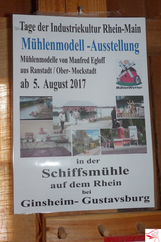 Zur Vorbereitung von Fern-Touren gehört zwangsläufig der Transport der Fahrräder. 18 Mitglieder des Biker-Treffs trafen sich zum Verladen mit PKW-Anhänger und Kleinbussen an der Turnhalle Geiß-Nidda. Eine Rhein-Main-Tour (geänderte Flughafen-Umrundung) stand auf dem Plan. Als Fahrrad-Start wurde Kelsterbach gewählt. Südlich des Mains ging's über Raunheim, Rüsselsheim, Bischofsheim, und die "Mainspitze" nach Ginsheim am Rhein. Attraktion des Tages war die dortige Schiffsmühle. Sie wurde in jahrelanger, ehrenamtlicher Arbeit und Spendengeldern durch Mitglieder eines Fördervereins funktions-fähig gebaut und mit Original-Baugruppen restauriert. Während einer sehr informativen Führung konnten sich die Radlerbeine etwas ausruhen. An diesem Tag fand zugleich der "Tag der Industriekultur Rhein-Main" statt. Manfred Egloff, Modell-Mühlenbauer aus Ober-Mockstadt, war gerade dabei, auf dem Schiff seine Modelle aufzubauen.