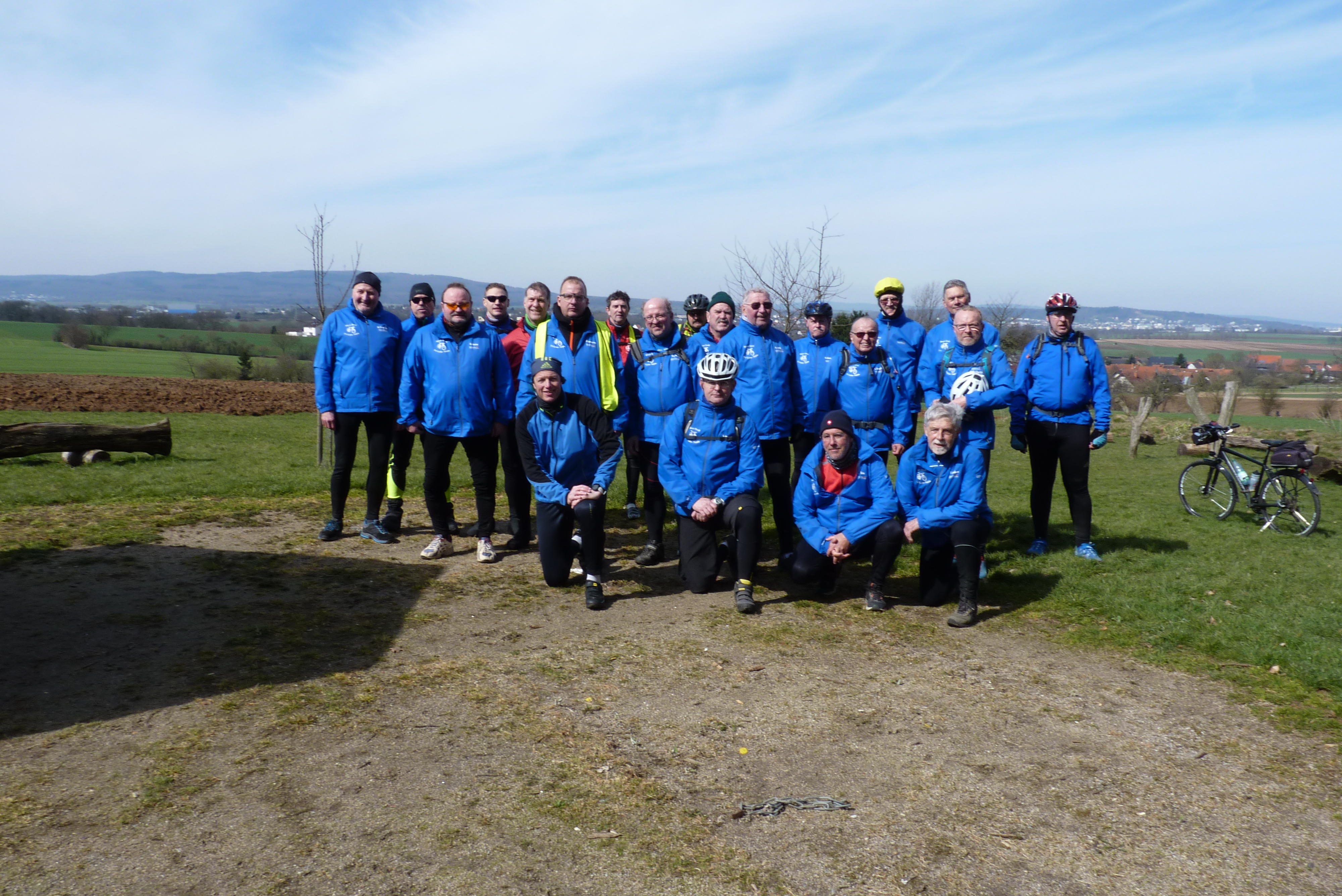 Zum Aufheizen und Warmhalten dienten die Schleifelder und Stammheimer Hügel sowie hinter Windecken die Hohe Straße. Diese bietet Aussichts-Höhepunkte auf die südliche Wetterau, den Taunus und die Frankfurter Skyline. Schon dafür hat sich der Kalorienverbrauch gelohnt. Nach den Gruppen-Fotos wurde die Tour zum Mittags-Imbiss nach Karben fortgesetzt. Auf der Hausstrecke R4 ging es zurück bis Nidda / GN (s.o.).